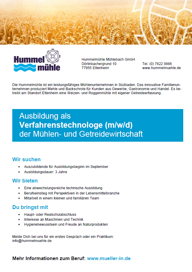 Die Hummelmühle Mühlebach GmbH ist ein Ausbildungsbetrieb. Wir bilden Dich zum Verfahrenstechnologen oder zur Verfahrenstechnologin in der Mühlen- und Getreidewirtschaft aus. Melde Dich bei uns für ein erstes Gespräch oder ein Berufspraktikum.